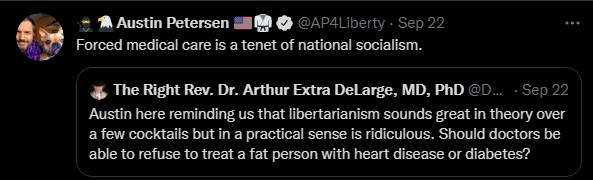 It is good to have regular reminders of errors in judgment from your past and as I have said before, my dalliance with libertarianism is one of those errors that are pretty painfully obvious in retrospect. Case in point, a guy I follow on Twitter, Austin Petersen, said this the other day: