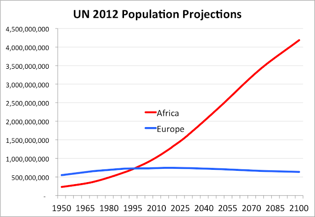 As sobering as that population chart is, I don't believe it will work out anything at all like that. Sure, if there were unlimited resources and no true pandemics to put a damper on the birth rates, there may well be 4 billion nappy haids in another 60 years. But the world is going to run desperately short of productive White and Yellow people willing to carry the helpless and incompetent blacks. As soon as first world largesse dries up, it becomes dog-eat-dog on the dark continent. Debbie Downer Malthus will crash the party, and together with his homeboy, Charlie Darwin, they will usher in self-correction.