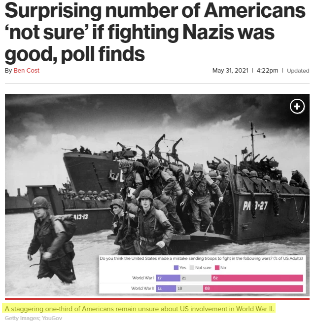 A lot of that is likely historical ignorance, I doubt you could find many Americans on the street that could locate WW II on a timeline within a decade, much less give more specific dates like Pearl Harbor and D-Day. On the other hand, what exactly did we “win” in WW II?