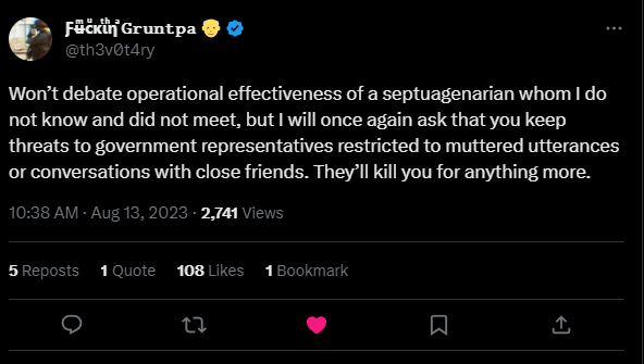 The mantra I keep hammering home is that you aren’t doing any good locked up in a Federal prison or dead in your bathrobe for saying something intemperate online. Not on social media, not on Telegram, not in “private” direct messages. None of it. Just don’t. What you say to your spouse or your close friends is one thing but it shouldn’t be said online where some asshole reading it can decide you are the next person who needs to be made an example of.