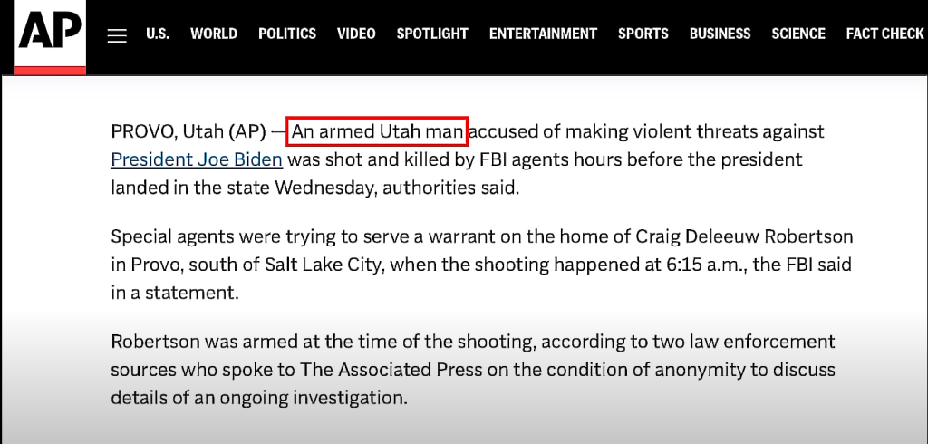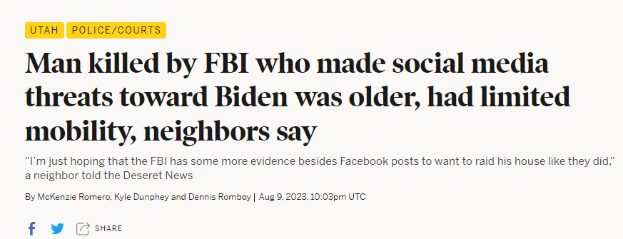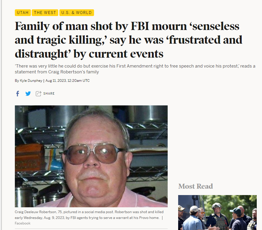 Most of you have probably already seen this story: an elderly man in Provo, Utah named Craig Deleeuw Robertson had made “threats” against Joe Biden on social media and got gunned down in his own home as a result. I put scare quotes around “threats” because what he was saying isn’t any worse than what people routinely said about Donald Trump when he was President and someone who is actually planning on doing something isn’t going to post about it on social media.