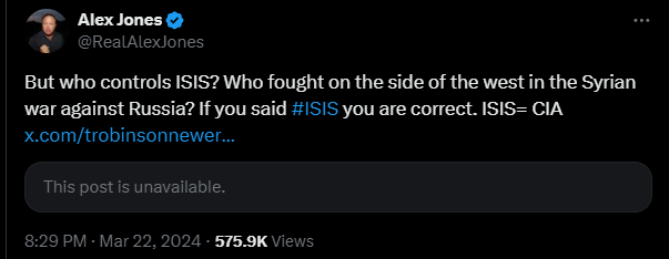 Ukraine has no hope of prevailing in this war unless they can somehow get Western powers to engage directly with Russia. Would Ukraine or Western intelligence use some dimwit goat humpers to commit am atrocity in Moscow hoping to provoke Russian into turning Kiev into a parking lot, so they could use that as a pretext to openly send in boots on the ground? Hell yes they would, even if it meant tens of thousands of Ukrainian casualties. Alex Jones is reminding anyone that will listen that ISIS is a creation of the CIA and has been used as a proxy before….
