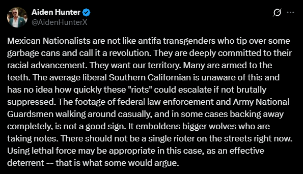 With the flow of illegals staunched the mission now is to force the mestizos out but the only way to do that is to make it untenable to stay here via crackdowns on employers and a significant tax on remittances back to Mexico. That was already tough enough but with the rioting in L.A. it is even more difficult.