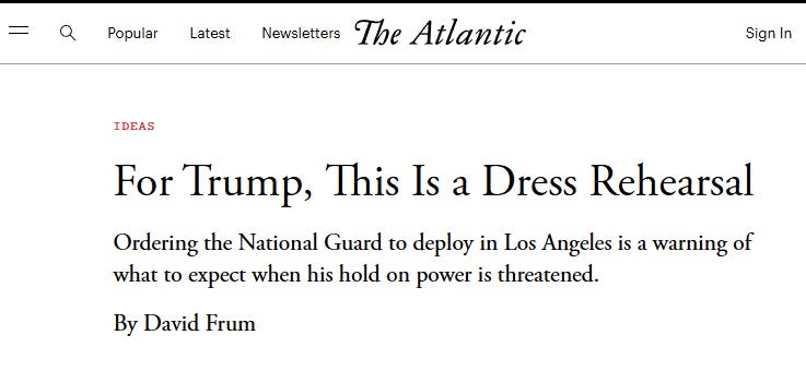 The wildcard is something people like Frum and Kristol apparently haven’t considered. They think Trump declaring martial law means a groundswell of opposition and Trump’s supporters abandoning him. In 2020-2021 that might have been true but at the risk of being repetitive, this is 2025 and that is lightyears removed from 2020. Now? I don’t care what Trump does to restore order.