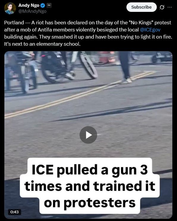 The much anticipated “No Kings” rally ended up being about what I expected, some significant violence in blue hives like L.A. and Portland….