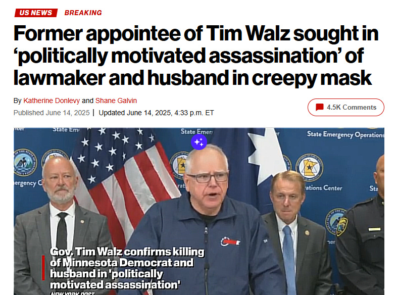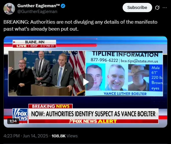 There was some unrest in other cities but generally speaking it seemed like the No Kangz nonsense was overshadowed by the assassination of a couple of Democrat state legislators by a disgruntled Democrat in Minnesota. The media is trying desperately to deflect from the fact that Vance Luther Boelter is a Democrat operative. Most of the coverage focuses on his targets (Democrat politicians) and an alleged list of abortion providers.