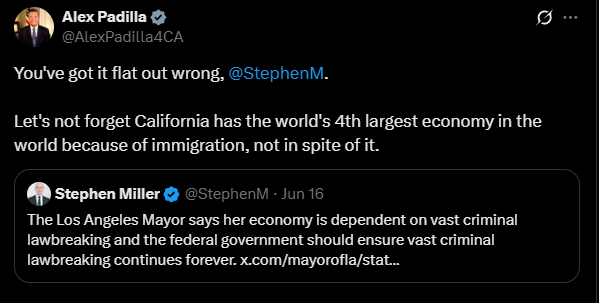 Padilla thought he was doing something clever because California has such an enormous economy. That is true, California does have a large economy to the tune of $4.172 trillion which is huge and per capita is $102,500. California’s gross state product is greater than all of Africa combined and almost all of South America combined.