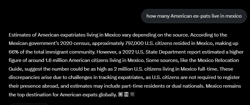 I would guess, based on a few cases I know personally, that a good percentage of “Americans” living in Mexico are of Hispanic ethnicity and still have family in Mexico. So, not really what they’re protesting against. Nope, the ones that get attention are the Whites who retire and move to the vacation resort areas. They bring big money and buy nice houses and live large. And most Mexicans I know can speak plenty good English where there’s money involved. So the signs stated “Speak Spanish” are total BS. Just one more talking point in the progressives’ plan to throw a whole bunch of shit at a wall just to see what sticks.