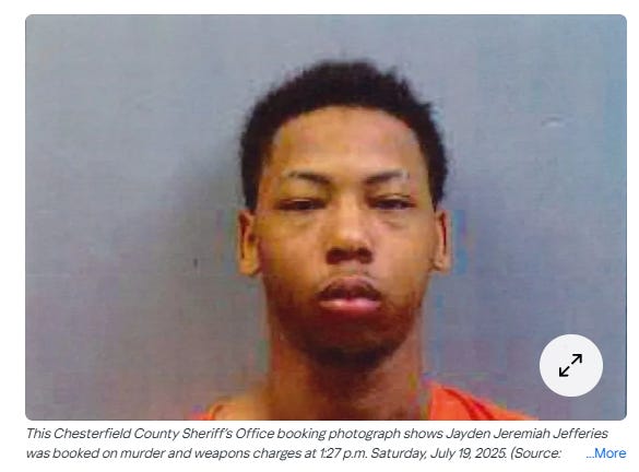 Chesterfield County court officials confirm Jayden Jeremiah Jefferies is charged with murder, possession of a weapon during the commission of a violent crime, and an additional enhancement involving a concealed weapon.