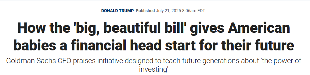 Quietly embedded in the One Big Beautiful Bill is a provision to provide a one time $1,000 payment from the government into an investment account for children.