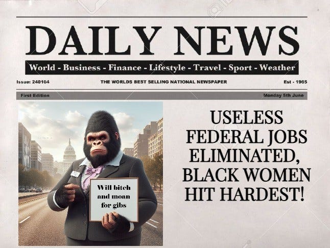 As an aside I followed the link the OP provided about the 28% of employees at the Dept. of “Education” being black women and it was unintentionally hilarious. It profiles black women who lost their jobs recently, like Quay Crowner. She can’t imagine why she was let go from her job as a “director of outreach, impact and engagement” in the “Education” Department. What does a “director of outreach, impact and engagement” do and what does it have to do with “education”? Nothing of course, it is an overpaid meaningless job overseeing other people doing overpaid and meaningless work. The Federal bureaucracy is full of these jobs and shockingly most of them seem to be filled by black women.
