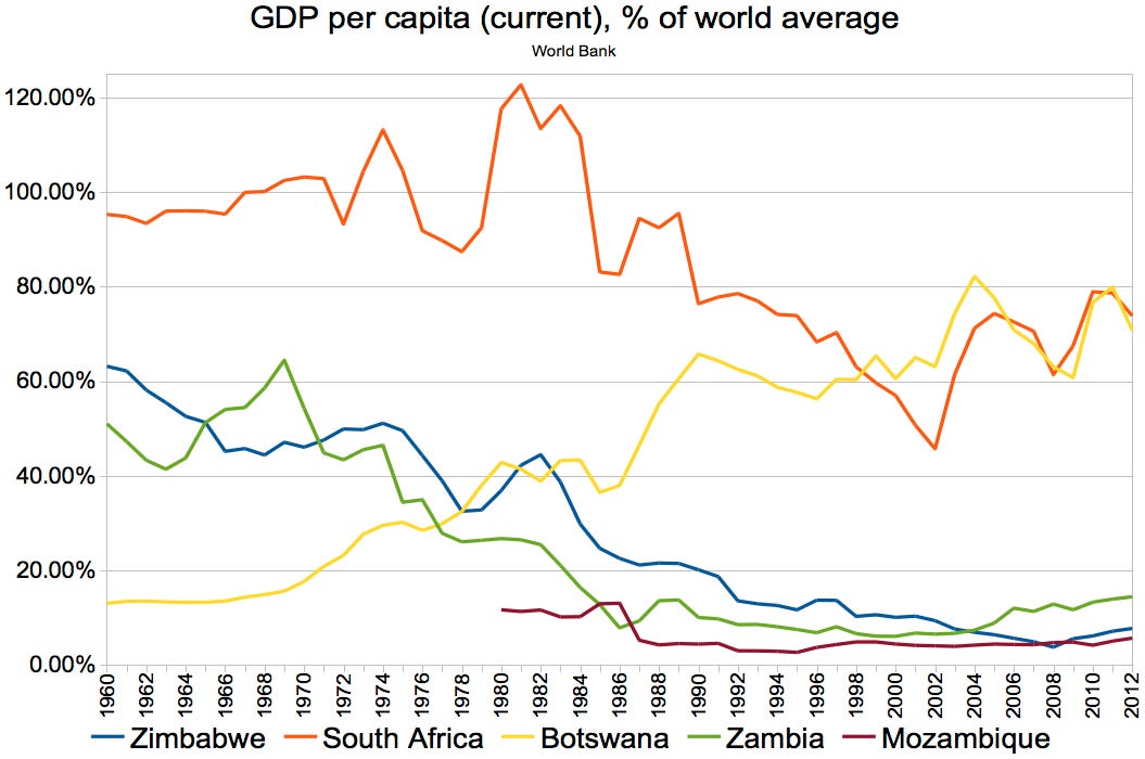 The results are completely predictable. Once a moderately thriving nation called Rhodesia, Zimbabwe is now an utter disaster. Per capita GDP is a whopping $2,005, ranking it near the bottom with the rest of the African nations, just below Congo (not the “democratic republic” of Congo). You might notice the precipitous drop-off at around the same time Zimbabwe achieved “independence” in 1965…