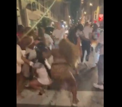 Another video shows the woman moments before she’s knocked to the pavement, approaching the men involved in the fight. Moments later, a woman in the crowd runs up to her and throws a punch. As she stumbles backward, another man punches her in the face so forcefully she goes limp and lies on the street, dazed.