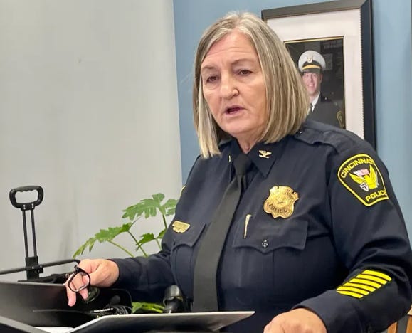 The “police chief” of Cincinnati, Teresa Theetge, looks even more haggard than usual…..