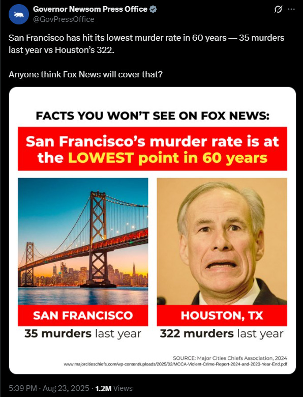 This means that Houston’s population is almost 2.8 times larger than San Francisco. Newsome’s Press Office didn’t bother to take this into account even though they referred to the “murder rate” because they (rightly) assumed that their core audience of mindless liberal sheep (but I repeat myself) won’t bother thinking about this, and will just respond to the post with a hearty “Orange Man Bad”.