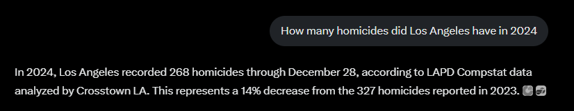 L.A. had 268 homicides last year. That is fewer than Houston and L.A. is has a significantly larger population, but putting 268 versus 322 isn’t really all that much of a gotcha, not like contrasting 322 against 35.