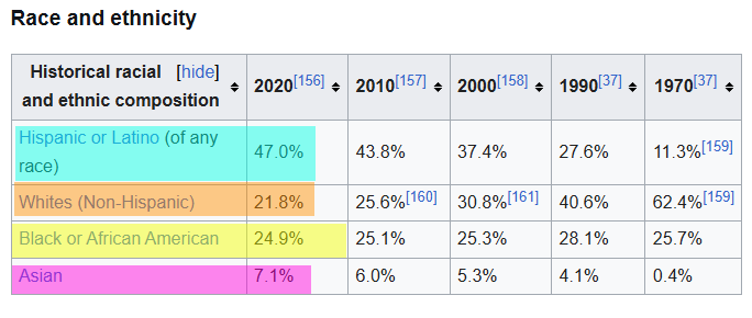 Houston has a black population that is shrinking relative to the overall population but still around 1/4 of the total and larger than the White population. Asians are growing quickly in the population but even combining Whites and Asians you still end up with a city that is less than 30% White/Asian. Mestizos are less violent than blacks but they still commit crime at significantly higher rates than Whites or Asians.