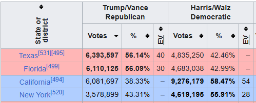On the other side, Cumala swallowed up over 6.3 million votes in Texas while still losing the state by 14% and she sucked in over 6.1 million votes in Florida, meaning 2 of the top 3 states where she received the most votes were states she lost to Trump.