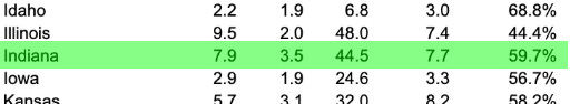 You find a huge disparity. The White homicide rate is a paltry 3.5, very low and less than half of the overall rate. Then look at blacks with a homicide rate of 44.5. The black homicide rate is 12 times higher than the White homicide rate. As a state Indiana is still overwhelmingly White….