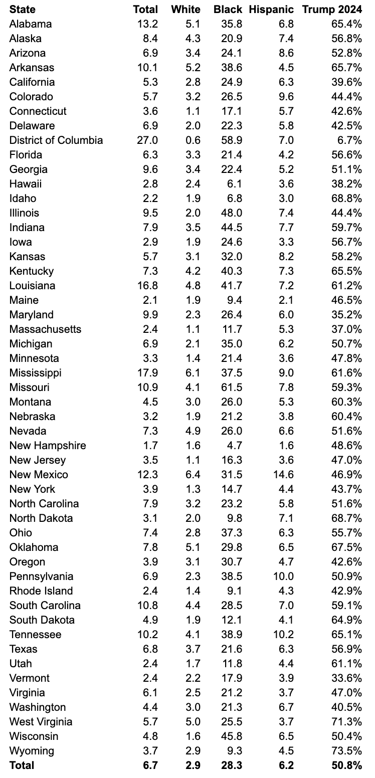 There isn’t a single state with a White homicide rate that reaches 7 while only 6 states have a black homicide rate in the single digits. Overall across the nation…