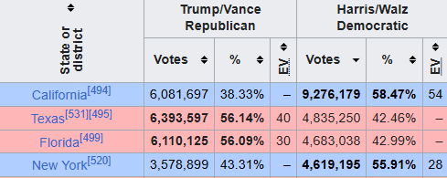 For example, while Cumala Whorris won her home state of California by a huge margin, 58.47% to only 38.33% for Trump, a difference of 20%, there were still were over 6 million votes cast for Trump in California. That means that other than Texas and Florida, more people voted for Trump in California than in any other state. Number 4 on the list of votes for Trump is New York, a state Whorris carried by a margin of 55.91% to 43.31%