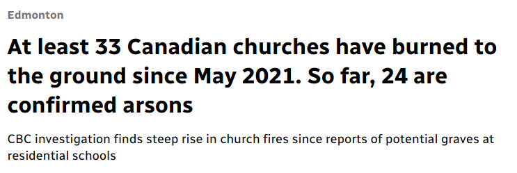 No one talks about all of the Catholic churches burned in Canada after the “mass graves” hoax at the Kamloops Indian school that turned out to be a mass grave with no bodies, aka a hole in the ground: ‘Biggest fake news story in Canada’: Kamloops mass grave debunked by academics. Over 100 churches were burned in Canada and even the CBC admits it was likely because of Kamloops.