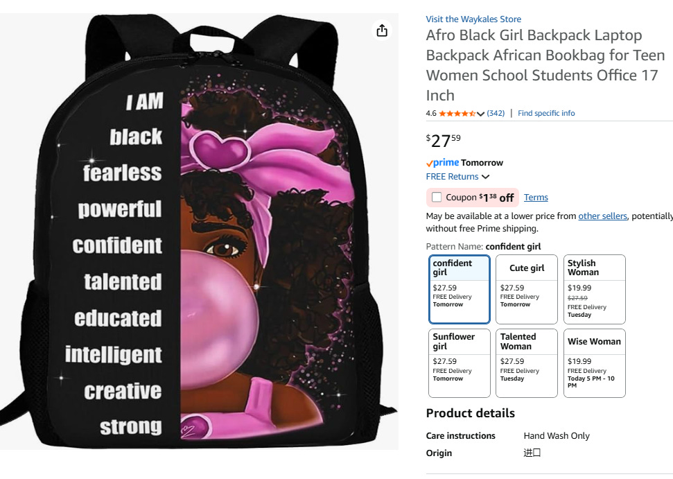 Can you imagine Amazon allowing the sale of a backpack for little girls that started off with “White” followed by a list of positive attributes? I don’t think they would allow it for Asians and maybe not even “Hispanics”. Only blacks get to sell stuff like this and that is OK with me because it is hilarious and cringe all at once.