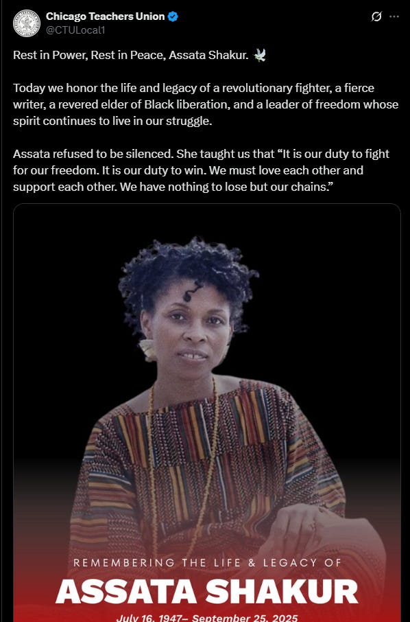 No mention of Asswipa Shakur being a convicted cop killer. You would think she was just a black “intellectual” who happened to live in Cuba, rather than a fugitive from justice who hid in a Communist hellhole to avoid being extradited back to the U.S.