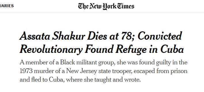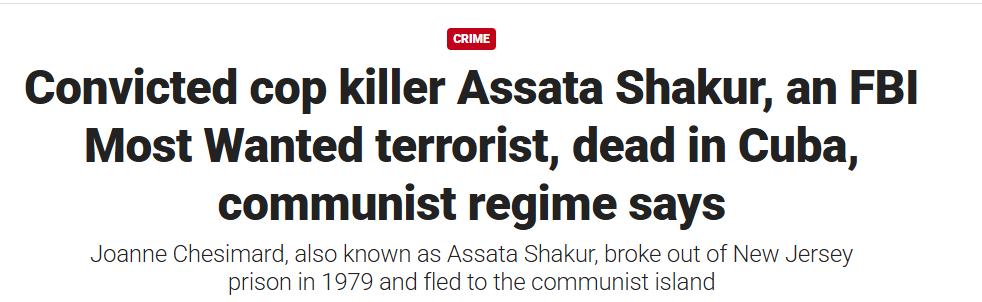 That brings us to a a more recent case as a black woman named Joanne Deborah Chesimard who went by the very silly made-up name of “Assata Olugbala Shakur” died last week in Cuba where she had been given shelter by the Communist regime.