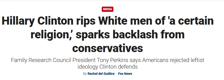 Notice that where Killary focused was on “White men”. She added “….of a certain persuasion, a certain religion, a certain point of view, a certain ideology…”, leaving it to her audience to fill in the blanks but she left no room for interpretation that she was talking about White men. Not black religious conservatives or Asian evangelicals.