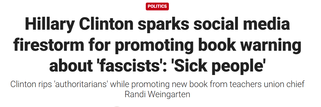Clinton’s comments caused “outrage” but she doesn’t care because her audience isn’t normal people but the loons on the left, and she was obviously signaling to them that despite Charlie Kirk being shot by an assassin who called Kirk a fascist, it is still acceptable and encouraged to call everyone you don’t like a fascist. You don’t have to understand what the word means, and in fact it is better for Them if you don’t.