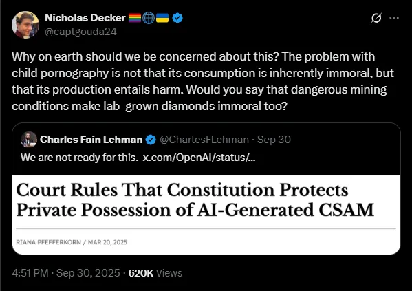Let’s pretend his statement was made in good faith (spoiler, it was not). What is the problem? AI child pornography doesn’t involve actual children in the production so no one is harmed, right?
