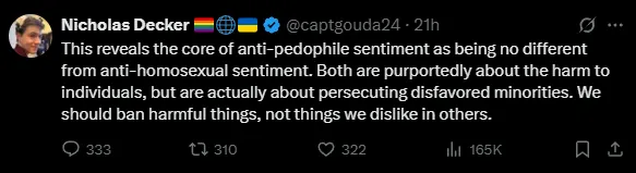 There was a time when people like Nicholas Decker were in the closet where they belonged and certainly they weren’t talking up fake images of child abuse as perfectly fine and not hurting anyone. Talking casually about how images of children being sexually abused was perfectly fine would get your ass kicked and those were absolutely better times.