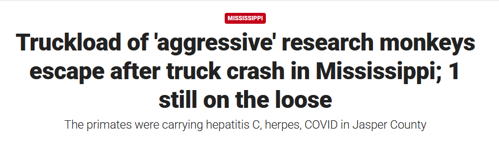 Truckload of ‘aggressive’ research monkeys escape after truck crash in Mississippi; 1 still on the loose