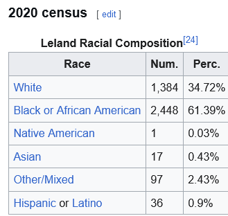 Leland’s population is just over 60% black but the high school is 94% black? This means that either the non-black population does not have school-age children, or (the more likely explanation) non-blacks are keeping their children out of the public schools almost entirely. All of the other towns cited herein show the same disproportion of black students to black population.