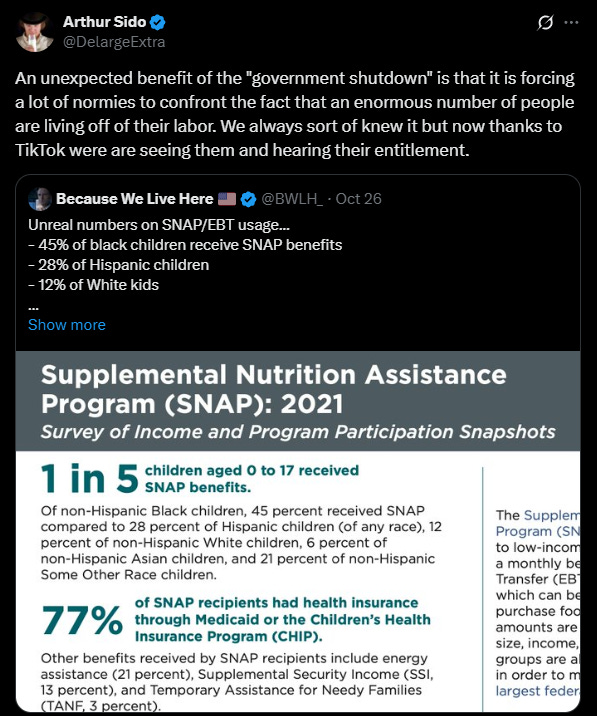 I really doubt much will come of this SNAP delay but hopefully it is one more red-pill for normies who have ignored the issue for a long time but when they see news reports saying over 40 million “Americans” get food stamps, or 1 in 8 people living in this country, and that many of those receiving these benefits are angry and entitled to the point of stating they are willing to steal, beat or even kill to get their food instead of getting jobs?
