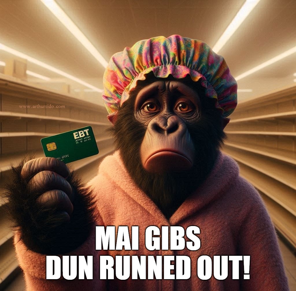 I assume most or at least some of the TikTok videos with blacks screeching and throwing their poo because of delayed EBT funding are performative for clicks but what this has done is shove into the faces of normie Whites that these people a) absolutely believe they are owed free food paid for by Whites (above and beyond any “reparations”), b) feel justified in stealing from stores if they don’t get the free food (“Dats what dey haz im-sure-ants for!”) and c) many of them are 3 or 4 generations deep in getting food stamps and have no intention of ever not getting them.