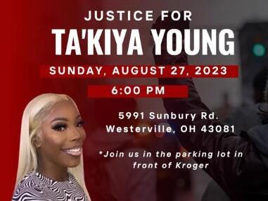 In the late summer of 2023, a womyn of colour named Ta’Kiya Young of all things was shot and killed outside of a Kroger grocery store near Columbus, Ohio. She was shoplifting from the Kroger while 7 months pregnant with a future felon, when confronted by officers in the parking lot she refused to exit her car and then drove her car into one of the cops who responded by shooting and killing her. She left behind a couple of other kids.