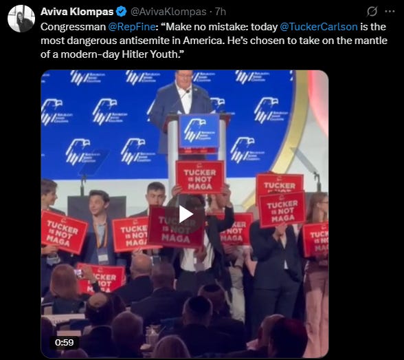 The backlash against Tucker Carlson has been predictably hysterical and over the top, as if the people being paid by Israel are in a contest to see who can say the craziest shit and I guess the winner gets to choose one video of them with farm animals to be removed from the Mossad library. Like this guy….