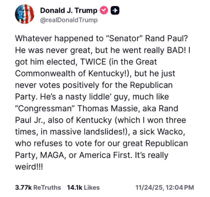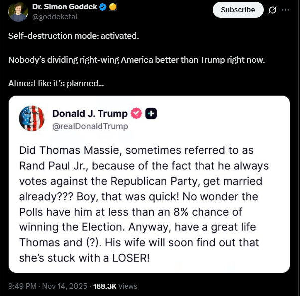 Looking at the recent off-year elections and the splintering of the Trump coalition and it is hard to imagine next November being anything but a bloodbath in the midterm “elections”. The GOP is apparently going to spend more money to try to unseat Thomas Massie in the primary than it is trying to elect Republicans to Congress.
