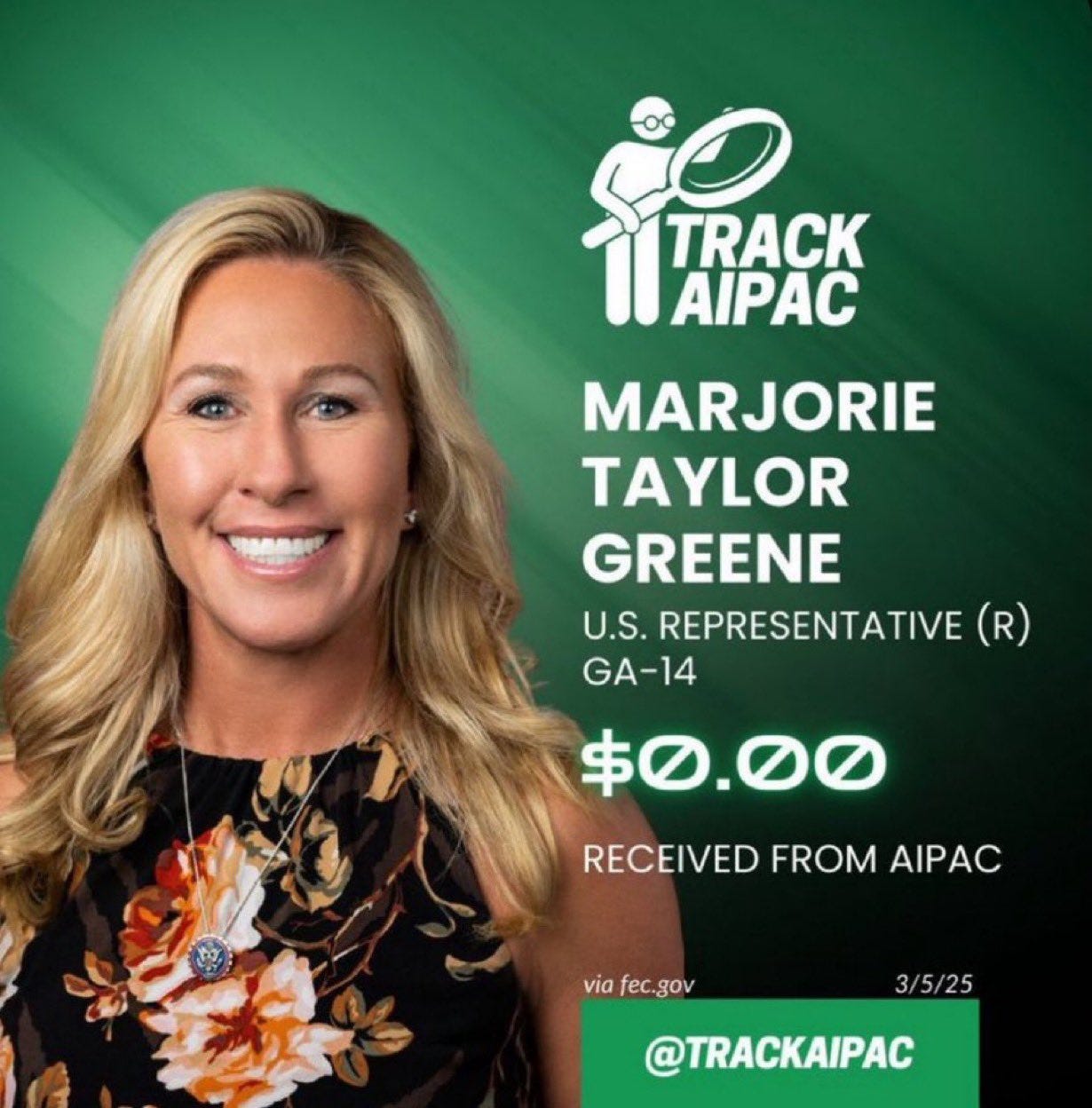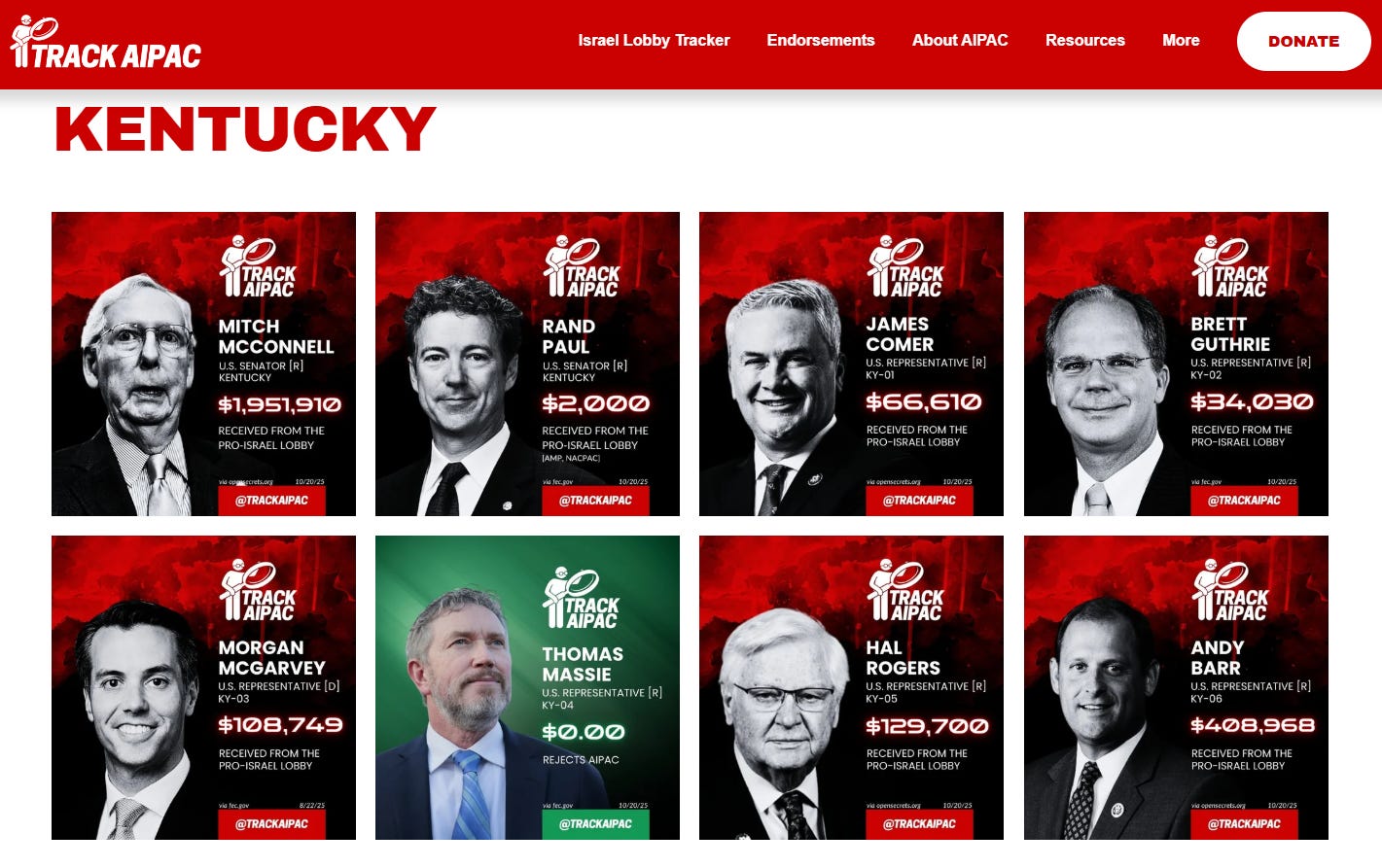 Something else she shares with Kentucky’s Thomas Massie who is alone in the Bluegrass State in not receiving AIPAC money (Rand Paul’s contribution is so small it makes me suspect it is a troll by AIPAC):