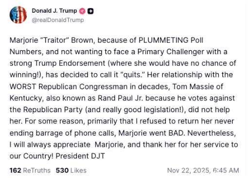 Then of course we have the saga of the once fervent Trump loyalist Marjorie Taylor Greene who made the critical error of pushing for the release of the Epstein files that Trump had promised to release. Trump shit all over her and the combination of knowing that she was unlikely to win a bruising primary against a Trump-backed opponent and also according to her resignation that the political system just simply doesn’t work for actual Americans, MTG called it quits.