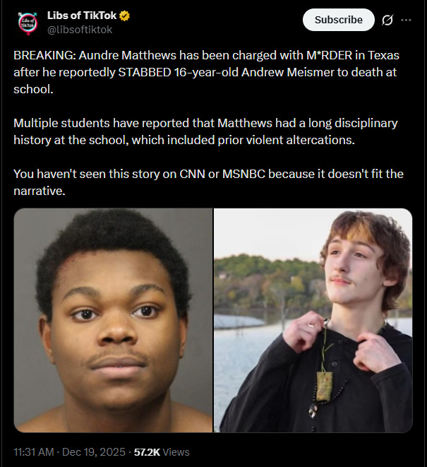 At least Aundre Matthews is 18 so there won’t be any question of trying him as an adult and in Texas hopefully he will get a serious sentence. It will be of no comfort to his family but the murder of Andrew Meismer might also be another wake-up call to radicalize young Whites into realizing that their very lives are considered expendable in the quest to replace the American people and tear down American society.
