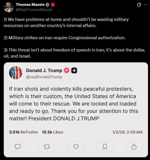 The protests in Iran are quite convenient. They may be legitimate, they also may be the work of Fifth Columnists stirring up trouble, knowing Trump said he will come to their aid. I fear isreal is pushing them behind the scenes to get Trump to strike Iran, and do isreal’s bidding.