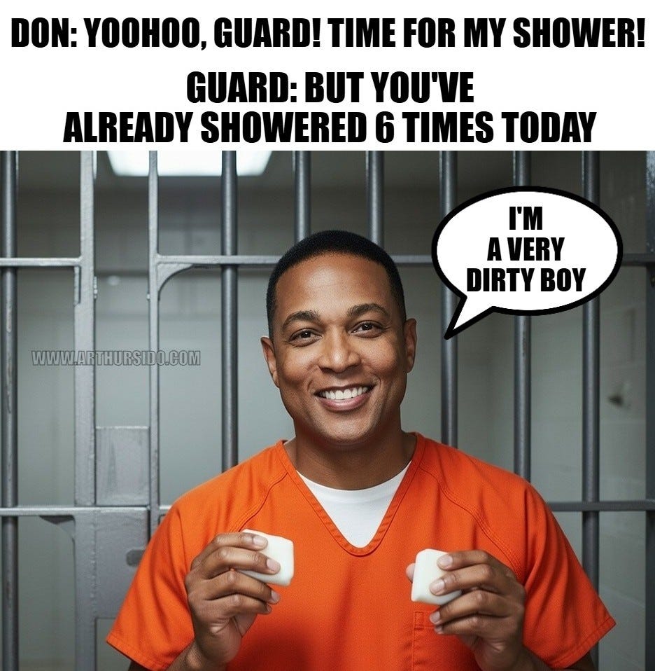 I can’t believe it, they actually arrested Don Lemon for his insurrection at a church. Nothing will come of it of course but at least for a short time it will be a hot time in the ol’ shower room at the local penitentiary.