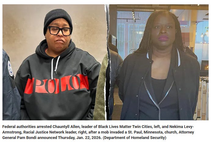 Bondi named Nekima Levy Armstrong and Chauntyll Louisa Allen as the suspects. FBI Director Kash Patel said Armstrong’s arrest was in connection with a violation of the FACE Act, which prohibits interfering with the exercise of religion at a place of worship.