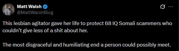 There were many a pearl clutched and fainting couch occupied by the sissies that pass for “conservative” influencers. How can you be so unfeeling?! She was an image bearer and such! She was a “poet” damnit! If we lower ourselves to their level then they will win!
