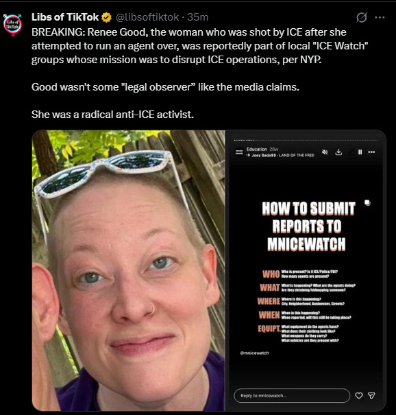 For those making an issue of a federal agent shooting and killing her and equating to the likelihood they’d do the same to any of us here, well yeah, no shit. I don’t trust cops/feds, and fully expect at some point they will be used against me and mine. That is unfortunate, but is kind of baked in at this point. And anyway, we now have three leftist shitheads made good (with two in Portland done up this evening). Better they are killing leftists than me, or any of the dissidents who frequent this place. When it gets to the stage they are after us, we at least have the tools and the talent to return fire, and won’t be trying to run them over with vehicle.