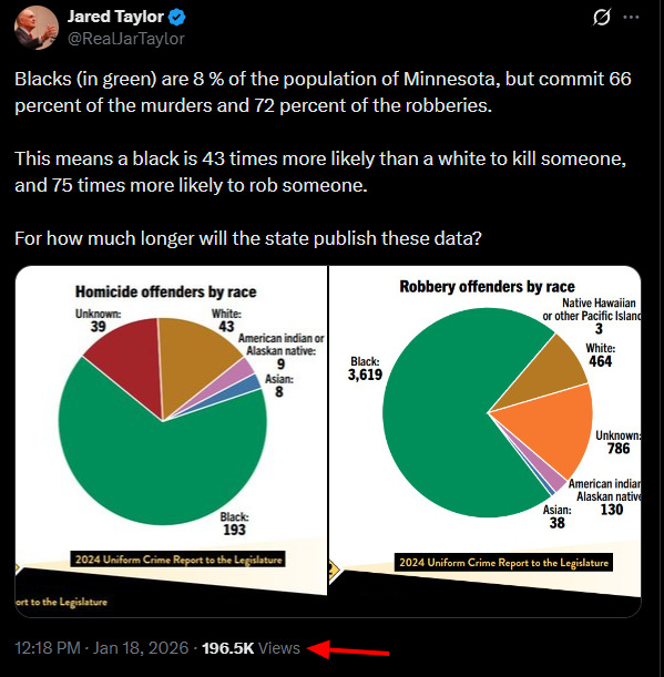 Was there crime in Minneapolis in 1968? I am sure there was. Was it anywhere close to the level of what we have seen in Minneapolis and every other major city in America? Of course it was not. Notice that chart doesn’t differentiate actual Whites from mestizos, Middle Easterners and the others lumped in as “White”. Of the 253 homicides where the offender race is known, 193 were black and 17 either Indians or Asians. If Minneapolis were 98% White again, homicides in Minneapolis would likely drop by something like 83% and probably more when you count mestizos and even more so when you assume that most of the 39 unknown killers are almost certainly black.
