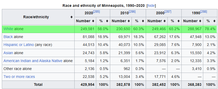 Minneapolis is barely majority White today and probably if the numbers were accurate Whites are not even in the majority of residents of Minneapolis.